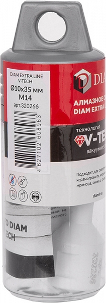 Алмазное сверло вакуумного спекания Diam Extra Line V-Tech M14 10 мм (Диам Экстра Лайн В-Теч М14 10 мм) предназначено для сверления отверстий Ø 10 мм, глубиной до 35 мм в керамике, граните, керамограните, мраморе, ониксе, травертине без водяного охлаждения при помощи ушм (болгарок), перфораторов, дрелей.