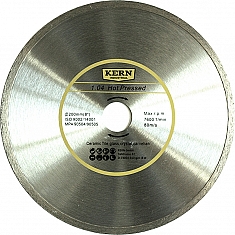 Алмазный диск Kern 1.04 Hot Pressed Continuous Rim 200 мм (Керн 1.04 Хот Прессед Континиус Рим 200 мм) – отрезной сплошной (со сплошным алмазным слоем) алмазный круг для мокрой алмазной резки керамики, хрусталя, стекла, сердолика, а также керамогранита, твердой керамики, тонкой керамики, керамической и кафельной плитки, природного камня, огнестойких (огнеупорных) стекловидных материалов и т.п. Применяется на отрезных и ручных углошлифовальных машинах (УШМ, болгарках), штроборезах (бороздоделах), электрических плиткорезах.