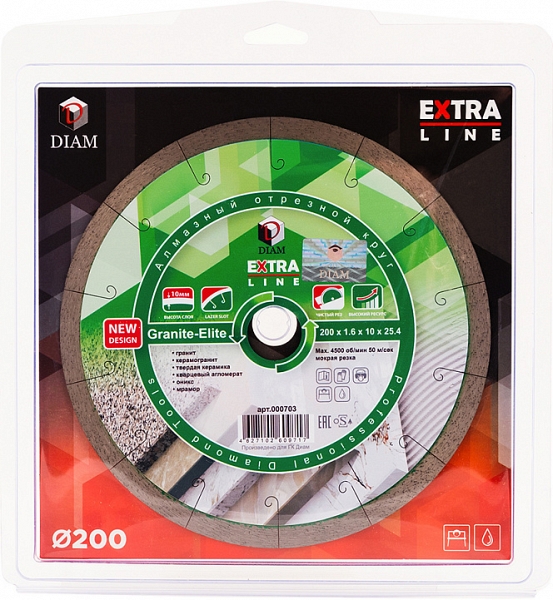 Алмазный отрезной диск Diam Extra Line 1A1R Корона Granite-Elite 200 мм (Диам Экстра Лайн 1А1Р Корона Гранит-Элит 200 мм) – премиальный алмазный круг для мокрой резки гранита, керамогранита, твердой керамики, кварцевого агломерата, оникса, мрамора, габбро, лабрадорита, базальта и других пород твердого натурального камня на болгарках (ушм), штроборезах и плиткорезах электрических с подачей воды. За долгое время зарекомендовал себя с отличной стороны у многих мастеров, как инструмент, обеспечивающий очень качественное выполнение задач практически по всем твердым материалам, при этом имеет очень большой ресурс и скорость работы.