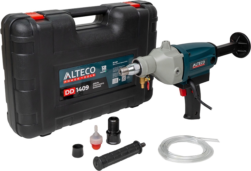 Дрель алмазного бурения Alteco DD 1409 (Альтеко ДД 1409) с защитой от перегрузки позволяет проделывать отверстия в бетонной или кирпичной поверхности, что очень удобно при проведении различных монтажных работ: прокладке труб, электропроводки и т.д.