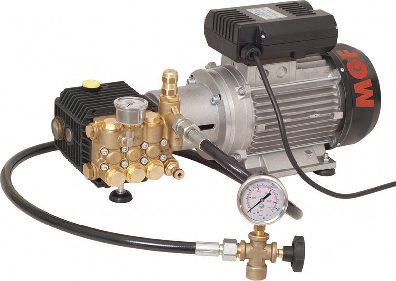 Электрический опрессовщик MGF Compact-120 Electro 120 bar, 4 l/min, 230 V (МГФ Компакт-120 Электро 120 бар, 4 л/мин, 230 В) – электрический испытательный опрессовочный насос высокого давления с манометром для гидравлических систем, противопожарных систем и систем отопления, для паровых установок на теплоэлектростанциях, в химической промышленности и на судах, а также для наполнения и создания давления в испытуемых установках.