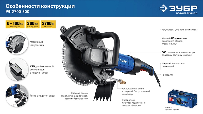 Электрический резчик по бетону Зубр Профессионал РЭ-2700-300 (Zubr Professional RE-2700-300) предназначен для наиболее трудных и глубоких (до 100 мм) резов любых материалов – бетона, асфальта, бордюров, металла, кирпича. Высокая мощность двигателя в сочетании с передаточным отношением редуктора дает большой крутящий момент на валу, что позволяет резать быстро и эффективно. Эффективный пылеотвод или работа с подачей воды защищают компоненты от пыли.