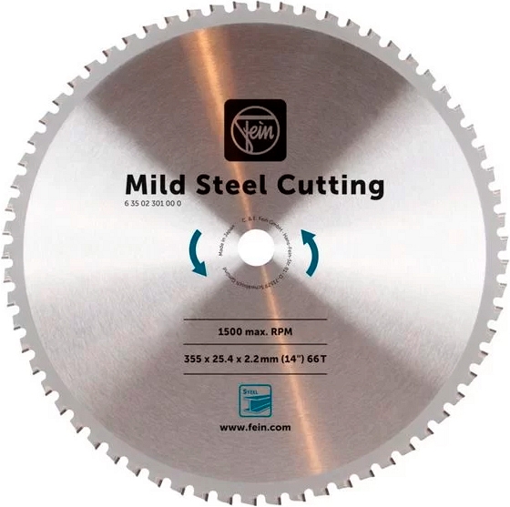 | 63502301000 | Fein Mild Steel Cutting 355×25,4×2,2 мм | Fein MKAS 355 | 355 мм (14") | 25,4 мм | 2,2 мм | 66 шт. | 1500 об/мин |