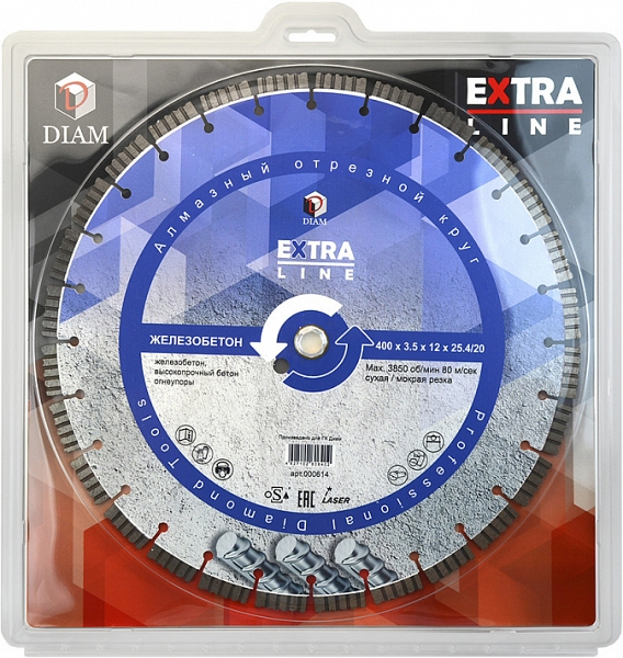 Сегментный алмазный круг Diam Extra Line 1A1RSS Turbo Железобетон 400 мм (Диам Экстра Лайн 1А1РСС Турбо Железобетон 400 мм) – профессиональный алмазный отрезной диск с лазерной сваркой сегментов для сухой и мокрой резки железобетона, старого высокопрочного бетона, клинкера, огнеупоров и других твердых материалов на бензорезах, электрических резчиках, камнерезных станках, стенорезных машинах, швонарезчиках, как с водяным охлаждением, так и без.