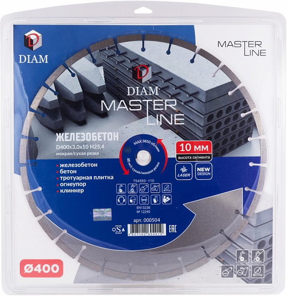 Сегментный алмазный круг Diam Master Line 1A1RSS Железобетон 400 мм (Диам Мастер Лайн 1А1РСС Железобетон 400 мм) – профессиональный алмазный отрезной диск для сухой и мокрой резки бетона, армированного бетона (железобетона), тротуарной плитки, кирпича, клинкера, огнеупоров и других строительных материалов, схожих по характеристикам, на бензорезах, электрических резчиках, камнерезных станках, стенорезных машинах, швонарезчиках и другом оборудовании, с подачей и без подачи воды.